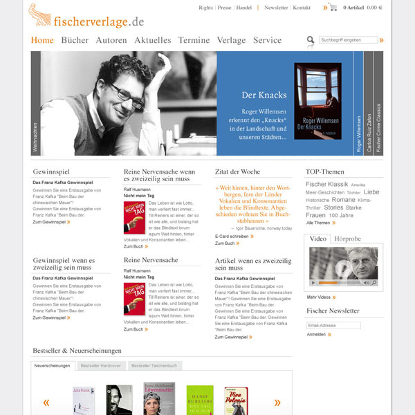 Highlights: Highlights sind das leichte, moderne Design sowie die Mulitmedia-Buchvorstellungen auf der Startseite. Dank SixCMS können die Redakteure der S. Fischer Verlage das Portal leicht pflegen und über flexible skinbasierte CMS-Module Gewinnspiele, Autoren- und Bücher-Microsites einfach erstellen.