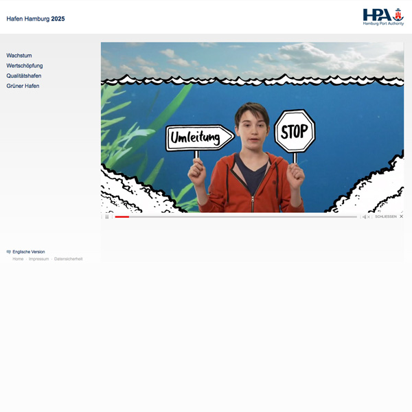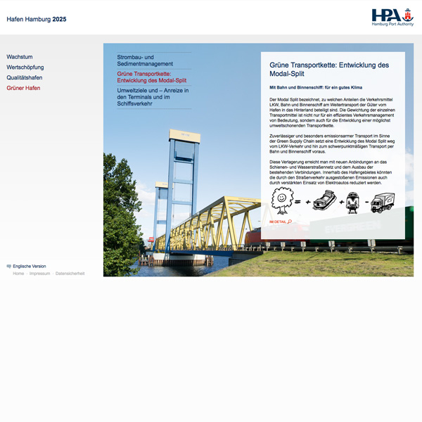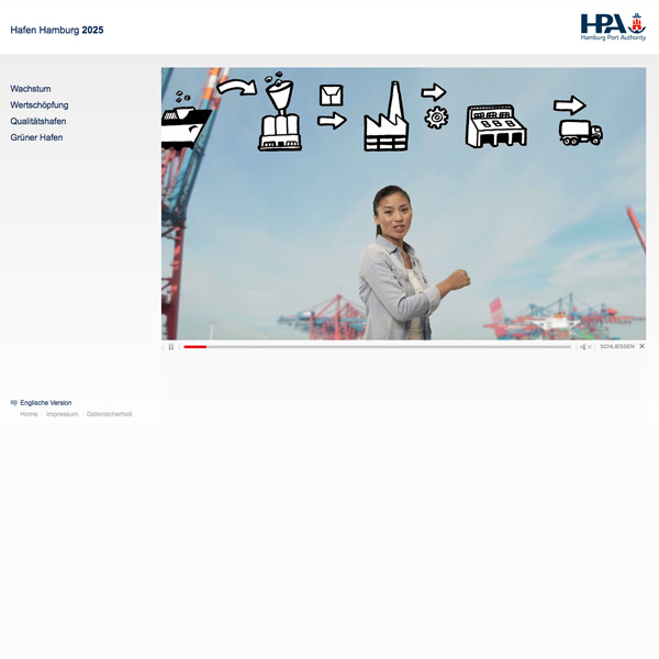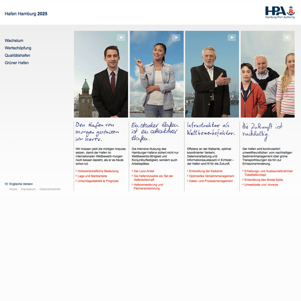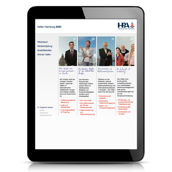 Herausforderung: Wachstum, Industrieförderung, Effizienz, und Nachhaltigkeit – das sind die Zukunftsthemen des Hamburger Hafens. opus 5 erhielt die Aufgabe, die Kernpunkte der zukünftigen Hafenentwicklung mediengerecht für ein breites Publikum aufzubereiten.